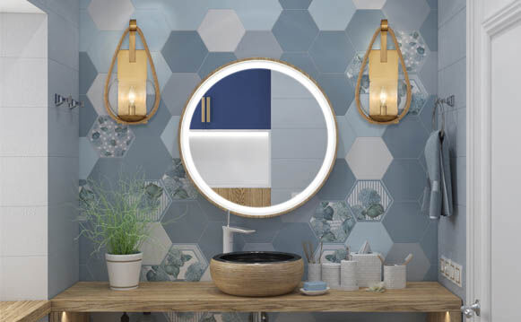 Nothing relaxes the mind and the body like a spa getaway. Elevate your client's bathroom to the staycation spa of their dreams with soft curves, natural materials, and warm tones. For a sophisticated, minimalist touch, consider a backlit mirror that reduces wall clutter and perfectly illuminates their vanity space.